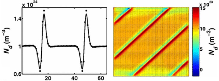 For many applications, the functionality of oxide materials and devices is ultimately determined by the concentration and diffusion dynamics of oxygen vacancies. The role of oxygen vacancies in phenomena such as fatigue and degradation in ferroelectrics is very important. The objective of this study is to reveal the dynamics of oxygen vacancies in the ferroelectric capacitors. The ferroelectric material is considered as n-type semiconductor where oxygen vacancies acted as single donors. The results showed that two Schottky barriers near the electrode/ferroelectric interfaces existed in both the 90° and 180° domain structures. It has also been observed that while an intrinsic electrostatic potential drop across the 90° domain wall created the electric fields which drove the electrons and oxygen vacancies aggregate on the different sides of the domain wall, the 180° domain wall had insignificant interaction with the potential, and no electron or vacancy accumulation in 180° domain structure was observed. Thus, polarization fatigue and leakage of ferroelectric capacitors are possibly originating from 90° domain walls. Polarization charge density is believed to be the origin of this difference. This understanding on the intrinsic interaction between the charged defects and domain walls provides the experimental researchers important suggestions to improve the performances of ferroelectric devices through designing ferroelectric domain structures. Details can be found in our PRB paper.